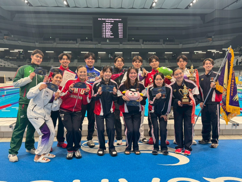 12月20日(土)・21日(日)の両日、「東京アクアティックセンター」に於いて「2025年度 関東学生選手権(25m)水泳競技大会」が開催されました。今大会は関東地区の大学生スイマーが集結し、短水路で行われる大学対抗戦です。本学水泳部からは22名が43種目に出場。